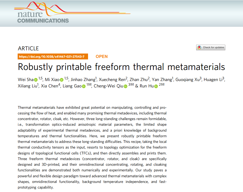12月10日,《自然·通讯》(Nature Communications)在线刊发了机械公司高亮教授团队与新加坡国立大学仇成伟教授、能源公司胡润副教授关于热超构材料拓扑优化设计的最新研究成果“Robustlyprintable freeform thermal metamaterials(稳健可打印的自由形状热超构材料)”。机械公司博士生沙伟、副教授肖蜜为论文共同第一作者,高亮教授、仇成伟教授、胡润副教授为论文共同通讯作者,华中科技大学数字制造装备与技术国家重点实验室为论文第一完成单位。 超构材料因具有常规自然材料不具备的属性被学术界和工业界广泛关注,如力、热、声、电磁超构材料等,其中热超构材料因可操控热流获得一系列超常热学功能(如:热隐身、热集中、热伪装、热旋转等)备受关注。随着变换光学和散射抵消方法应用于热学领域,一系列具有不同功能的热超构材料纷纷被设计和制备,但是,目前热超构材料设计仍面临三大挑战:(1)利用变换热学法设计的热超构材料需采用非均匀、各向异性的材料参数,而常规材料往往不具备,使得实验制备热超构材料难度很大;(2)热超构材料结构形状受限,目前以圆形、椭圆形等规则形状的热超构材料制备居多,影响了热超构材料的工程适用性;(3)采用数值优化方法设计热超构材料依赖背景温度场和目标超常热学属性,影响了设计的灵活性和热超构材料的全方位功能性。因此,如何设计并制备具有自由形状且全方位功能性的热超构器件是热超材料领域亟需解决的难题。 图1 稳健可打印的自由形状热超构材料拓扑优化设计 针对以上难题,研究团队提出了一种稳健可打印的自由形状热超构材料拓扑优化设计方法(图1),采用拓扑优化设计具有指定导热系数的拓扑功能单胞,组装生成热超构材料,开展了自由形状热超构材料拓扑优化设计-热超构器件增材制造-热学仿真与实验性能测试。研究团队按照上述思路,设计了具有自由形状的热集中、热旋转和热隐身等三类热超构材料构型,并开展了数值仿真(图2)和热学实验(图3)性能测试,结果表明无论热流从何种方向通过三种热超构材料,其内部各自呈现出良好的热集中、热旋转和热隐身效果。 图2 拓扑优化设计的三种热超构材料及其数值仿真温度场分布(左:热集中;中:热旋转;右:热隐身) 图3 3D打印制备的热超构器件及其热学实验温度场分布 研究团队采用拓扑优化方法设计了具有自由形状、全方位功能性的热集中、热旋转和热隐身超构材料,达到了当前利用混合材料结构实现热超构材料设计的最好水平,将有力推动热超构材料在航空航天、电子等领域的工程应用。研究工作得到了国家自然科学基金(52076087)、国家重点研发计划(2020YFB1708300)等项目资助。(原文链接:https://mp.weixin.qq.com/s?__biz=MzU1OTI0NjU0Mw==&mid=2247484318&idx=2&sn=29300743467c0a4f98e40c28e609e3ed&chksm=fc1b7e3ecb6cf72807021182ce55d71e1e8531abb50c660a871555a2332b315eb8d9bb3254c6&scene=27)