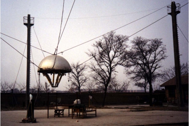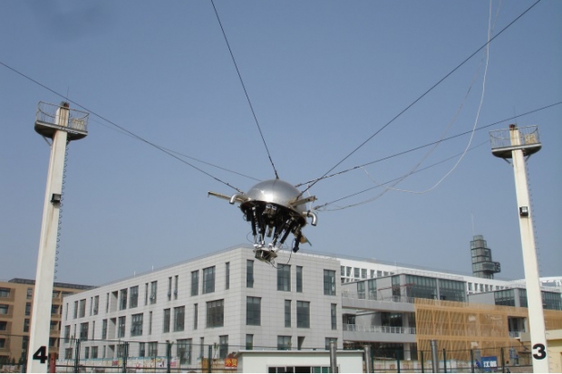 第二个模型是在中国科公司知识创新工程重大项目支持下进行的,位于西安市南郊的沙井村,是一个1:10比例的50米室外模型。在这一模型中,6个支撑塔的高度为15米,均匀分布在直径50米的圆上,馈源舱为直径2.5米的半球。实验中为了抑制振动,这一模型对6悬索并联系统方案还做了微调,增加了2根向下拉的悬索。