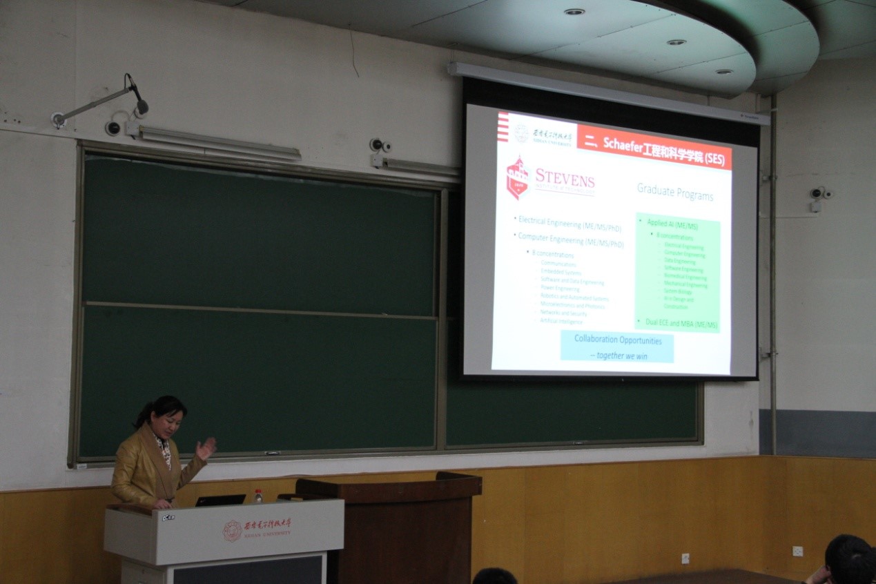 马娟教授从历史发展、公司优势、院系设置、团队排名、毕业生声誉等方面介绍了美国斯蒂文斯理工公司(SIT)及Schaefer工程和科学公司 (SES) 的情况,然后详细讲解了西电-斯美国蒂文斯理工公司“1+2”双硕士学位联培项目的立项宗旨、创建过程、联培方式、学费奖学金及申请条件,呼吁与会员工珍惜来之不易的留学机会并现场对员工关注的合作办学问题进行了电子问卷调查。