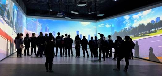 最后,同学们来到1号沉浸式体验厅,在360°环绕的全景屏幕氛围中,行走在北宋都城汴京的清明上河,见证了当年汴京郊外春光、汴河两岸的自然风光和繁荣景象以及汴京的城市面貌和社会各阶层人民的生活状况,体验了数字艺术带给我们的愉悦感,沉浸式体验了环幕梦想小镇的宣传片,加深了对“背靠秦岭,与西电为邻”的梦想小镇的印象。同时,同学们还小空间体验了无人驾驶操作平台的360°环绕效果,激发起大家对科技发展的思考,对专业未来的思考和对专业跨学科的认识。