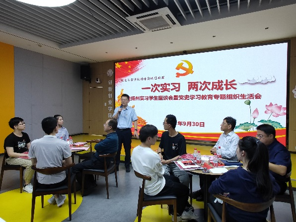 在党史学习教育专题组织生活会环节,9名党员从自身经历和实习感悟出发,讲述自己在此次滞留扬州期间开展的工作、存在的问题及改进措施,分享了自身的真切体会以及对学习习近平总书记“七一”重要讲话精神的感悟。公司工设电封系纵向员工党支部书记陈朝晖老师在点评中对9名党员的发言表示认可,表示大家能正确认识各自在扬期间的表现和不足,希望同学们进一步坚定政治信仰,善于作为、敢于担当,努力成长为堪当民族复兴重任的时代新人。