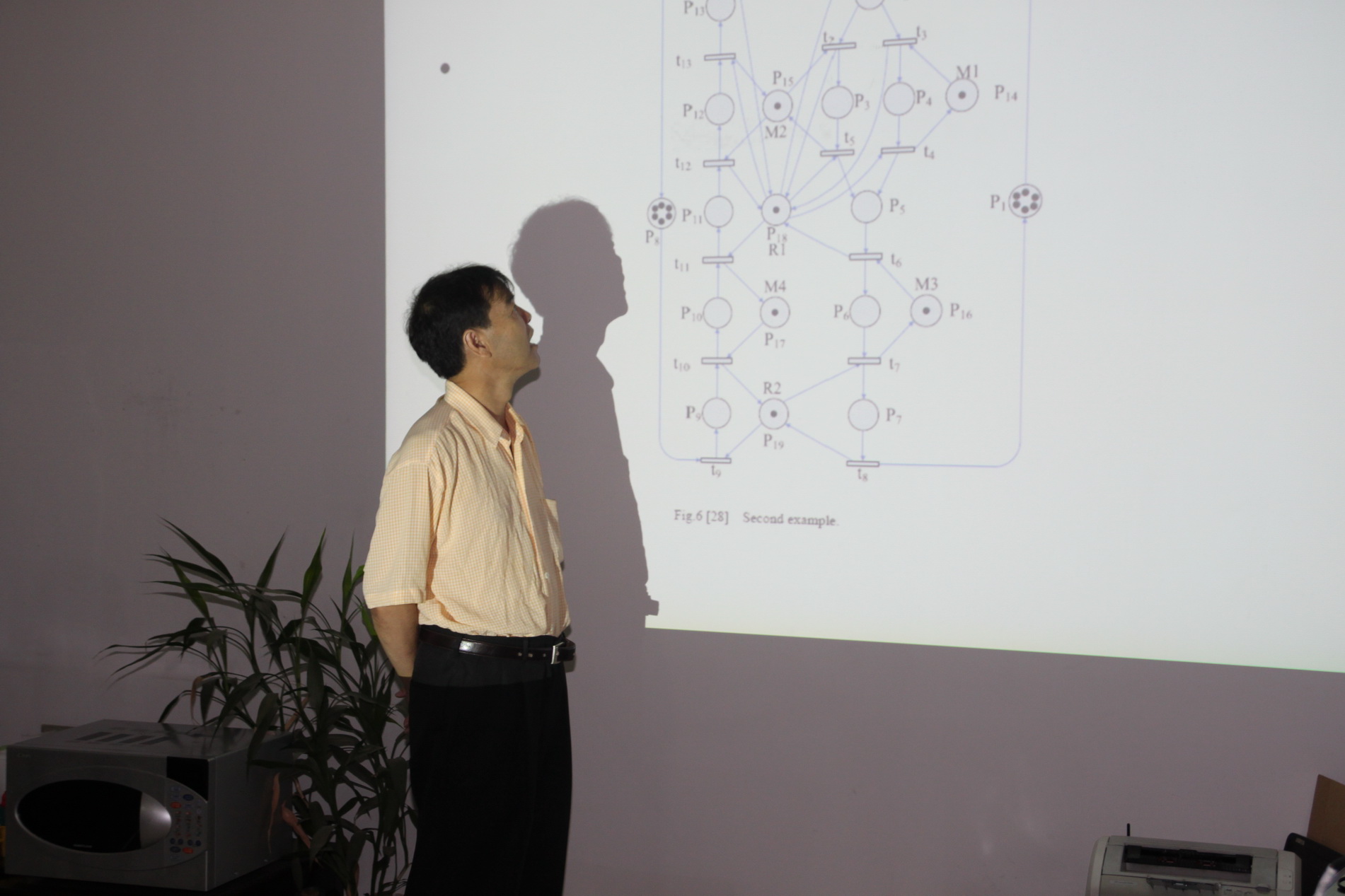 而首遇坏标识方法(FBM: first-met bad marking method) 通过采用局部区域法改进一些控制器从而可以得到更多的可达状态,但是却要添加较多的控制器。赵玉教授的报告向与会教师和博士生介绍了改进了基于信标的死锁控制和首遇坏标识方法,使得基于信标的方法在添加较少控制器时能得到更多的可达状态。对于FBM的方法则减少了所添加的控制器,减小了控制系统的结构复杂性。赵玉教授还向与会师生介绍了Petri网的历史与发展,以及现今Petri网研究的前沿方向。