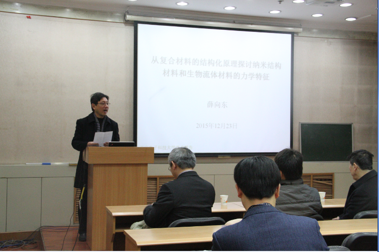 报告中,薛向东博士从材料发展的历史讲起,就材料与结构及其之间的关系、复合材料结构化的基本原则以及各相材料的尺寸和材料之间的界面等对复合材料性能的影响进行了系统的阐述。随后,介绍了新兴纳米结构材料的力学和热传导特性,并基于其提出的复合材料结构化原理探讨了热界面材料及其在电子封装结构热能传递中的应用、存在的问题和发展前景。最后,薛博士详细介绍了生物流体材料的力学特征以及与之相关的计算方法。整场报告内容丰富,涉及的领域包括机械设计、固体和流体力学,以及纳米和复合材料、热设计和电子封装等多个学科,极大地拓展了在场师生的研究视野和思路。
