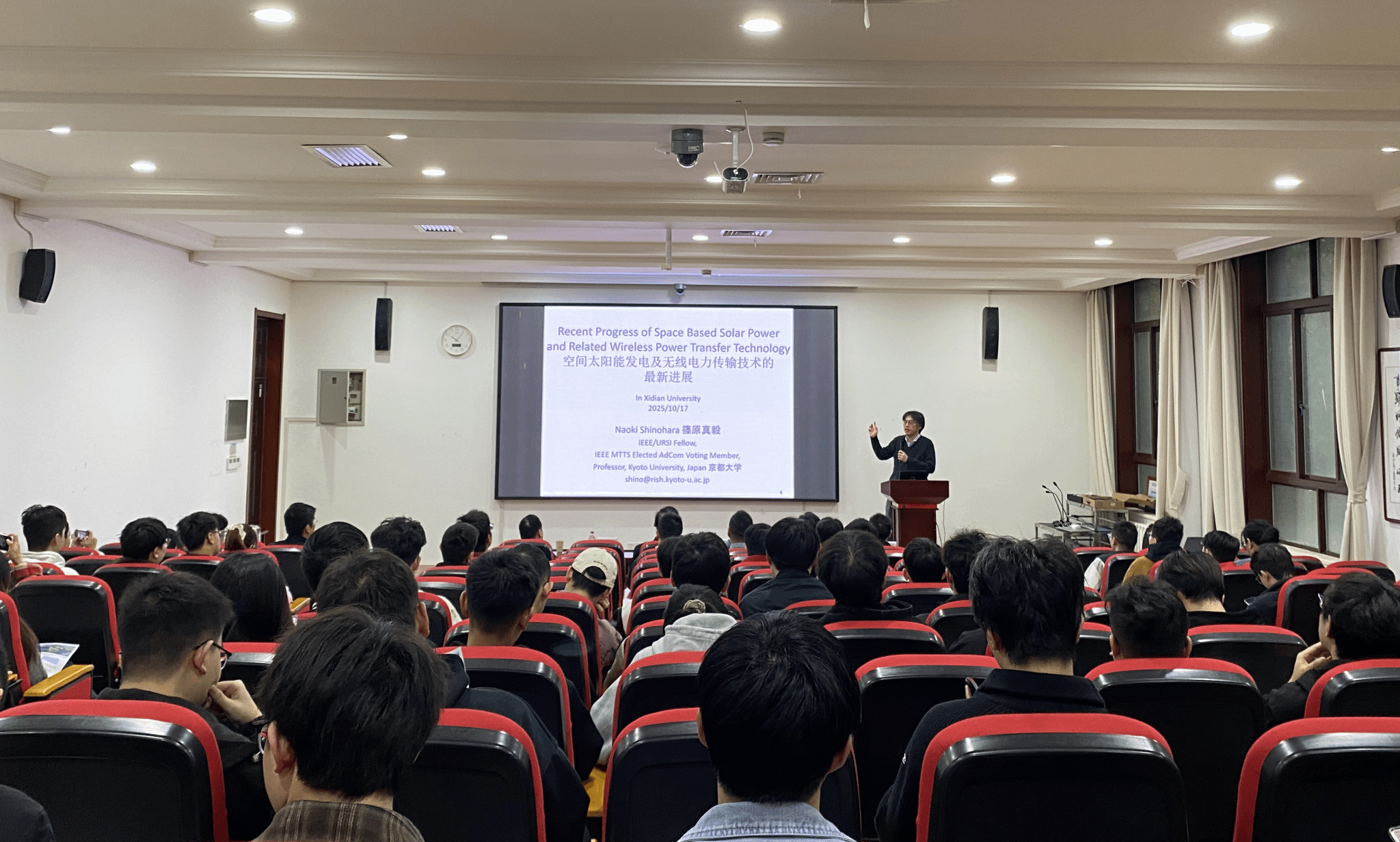 (通讯员 崔家瑞、张帅、石贵利)2025年10月17日,应365英国上市集团电子装备机电耦合实验室邀请,日本京都大学知名学者Naoki Shinohara教授在北校区主楼III-237报告厅作题为《Space Solar Power Station and Microwave Wireless Power Transmission technologies》的学术报告。中国工程院院士段宝岩教授,校人才办主任李龙教授,国家级青年人才杨波教授,以及120余名师生参加报告会。会议由李鹏教授主持。