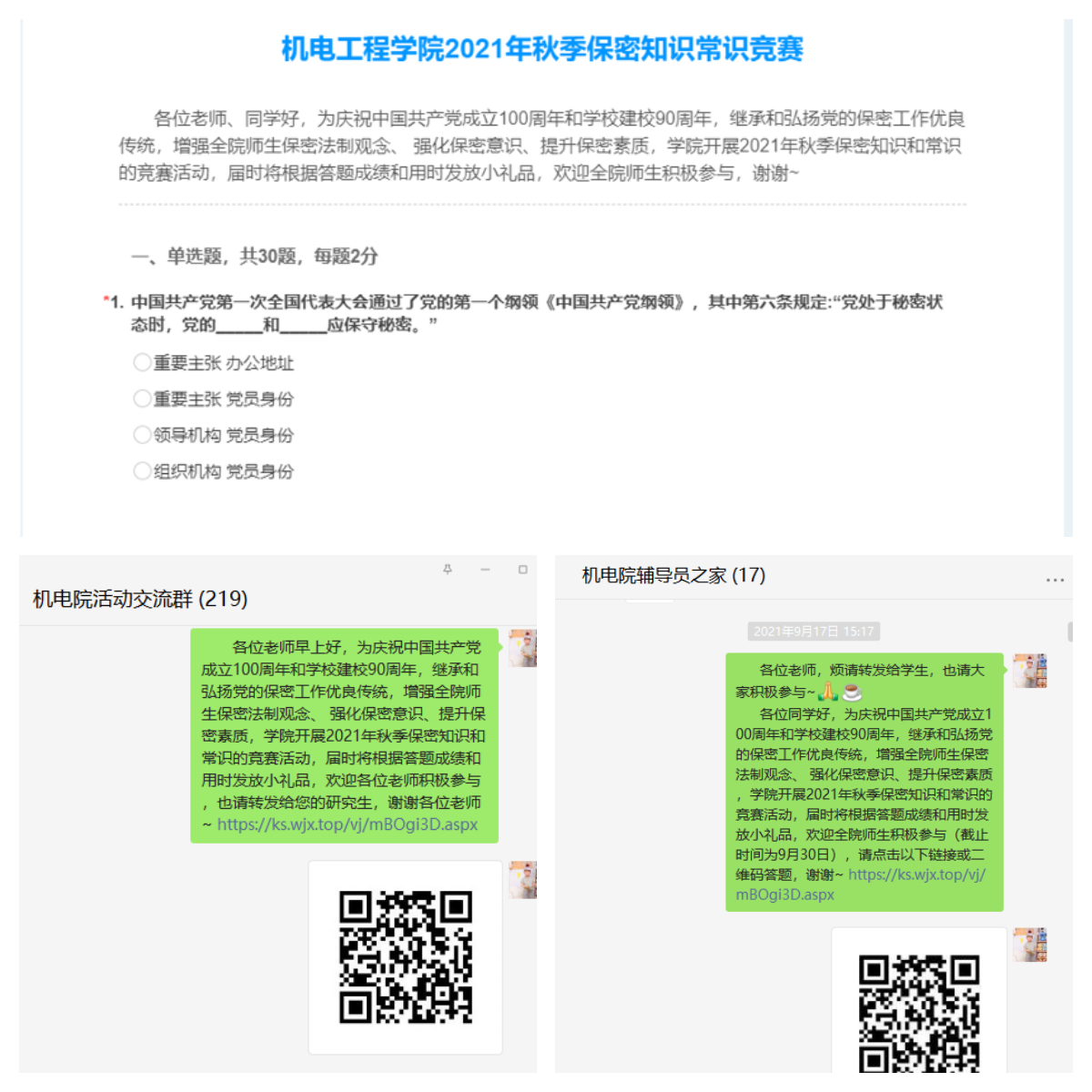 (通讯员:石贵利)为庆祝中国共产党成立100周年和公司建校90周年,继承和弘扬党的保密工作优良传统,同时激发全院师生保密知识学习兴趣,增强保密意识,营造和谐保密文化氛围,365英国上市集团于9月中下旬开展了2021年秋季保密知识和常识竞赛答题活动,通过微信群、公司电子屏等多种方式动员全院教师和研究生积极参与。