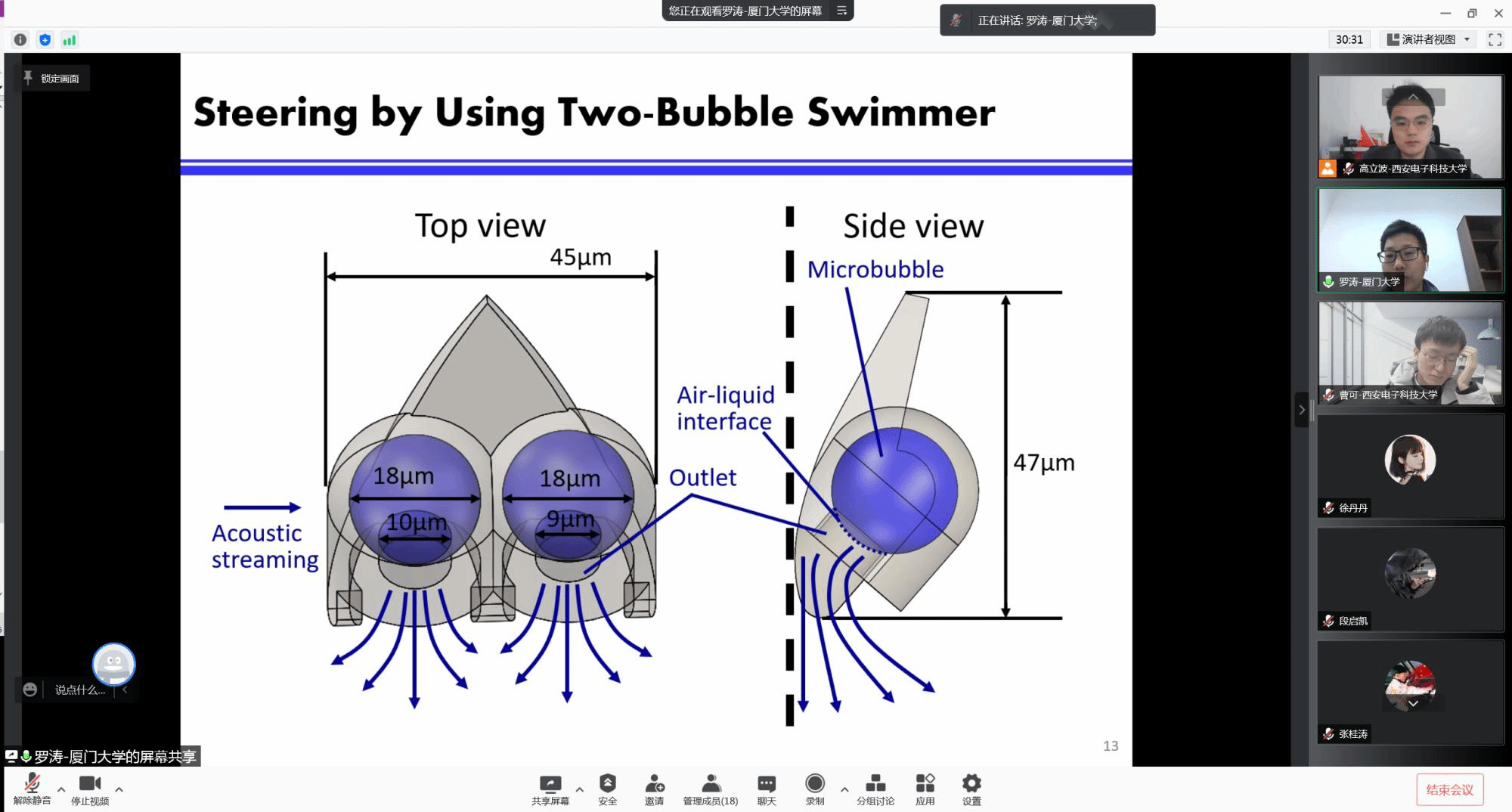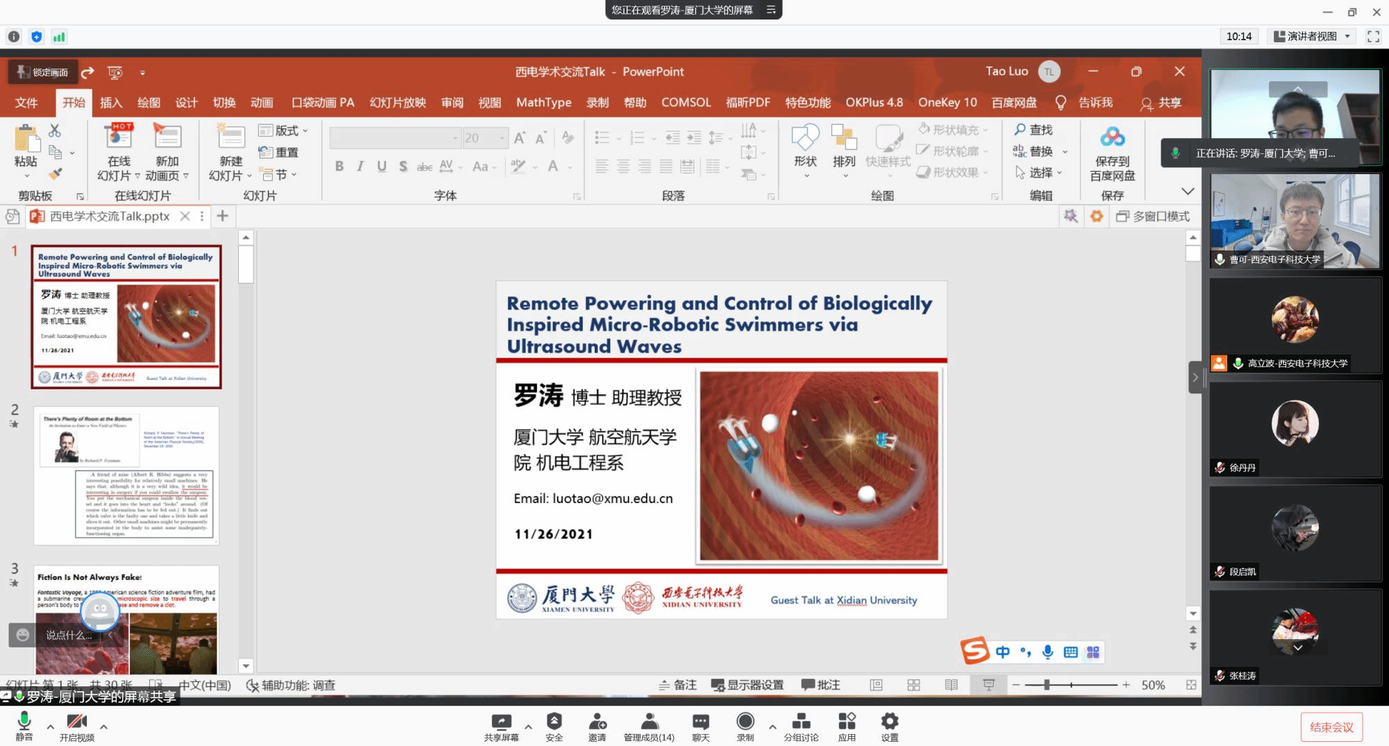 (通讯员 高立波)11月26日上午,应365英国上市集团高立波的邀请,厦门大学航空航天公司机电工程系助理教授应邀在线上作了题为《Remote Powering and Control of Biologically Inspired Micro-Robotic Swimmers via Ultrasound Waves》的学术报告。本次报告因疫情原因改为线上,高立波,王明智,曹可等测控系师生参加,高立波副教授主持。