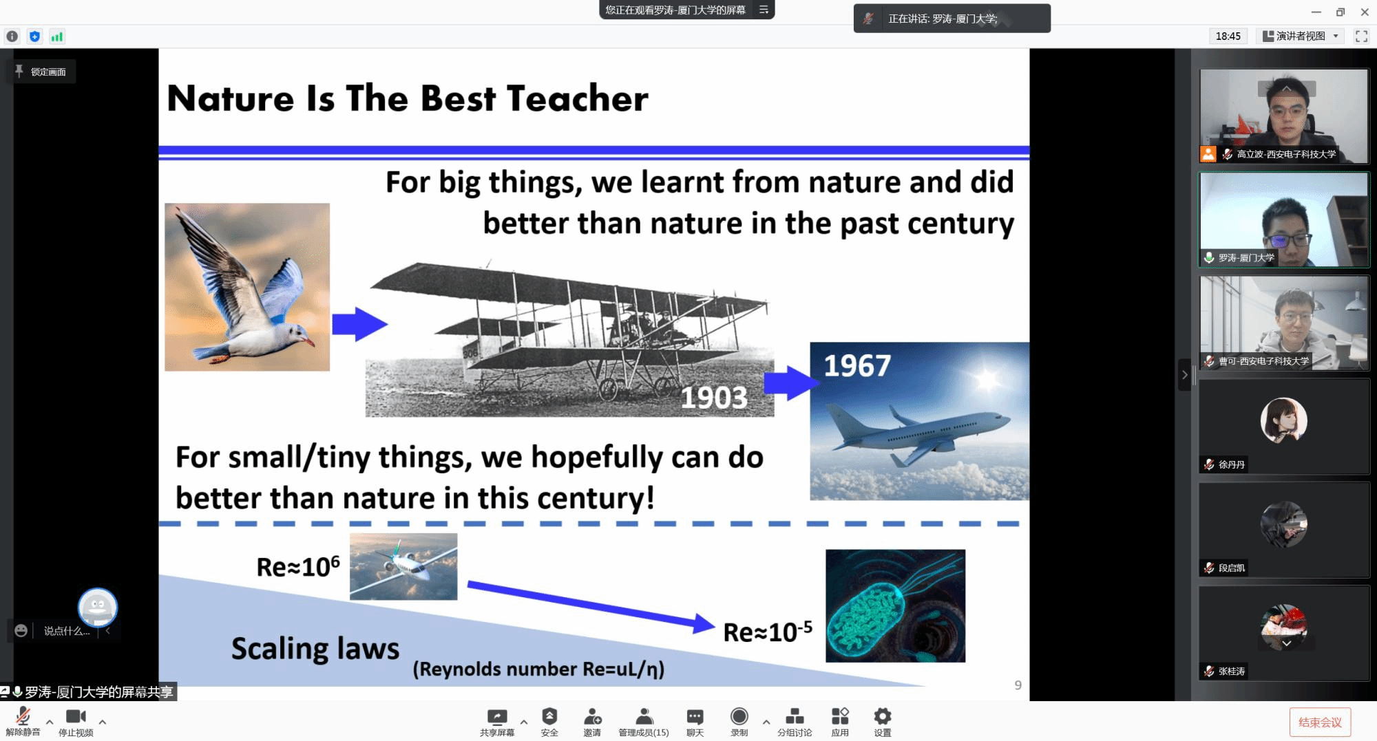 最后高立波老师总结发言:罗教授的讲解深入浅出,将微纳机器人所面临的困境、难点以及创新点都进行了总结,值得我们好好学习。